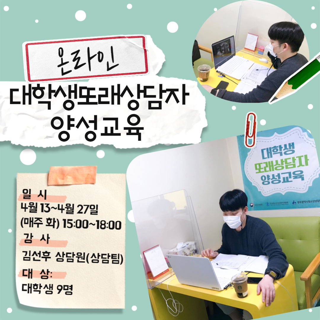 4¿ù13ÀϺÎÅÍ ¸ÅÁÖ È¿äÀÏ 15:00~18:00, 3ÁÖ°£ ¿Â¶óÀÎ ±³À°À¸·Î ´ëÇлý ¶Ç·¡»ó´ãÀÚ ¾ç¼º±³À°ÀÌ ÁøÇàµÇ°í ÀÖ½À´Ï´Ù. À̹ø ±³À°Àº »ó´ãÆÀ ±è¼±ÈÄ »ó´ã¿øÀÌ °»ç·Î ÇÔ²²ÇÕ´Ï´Ù.