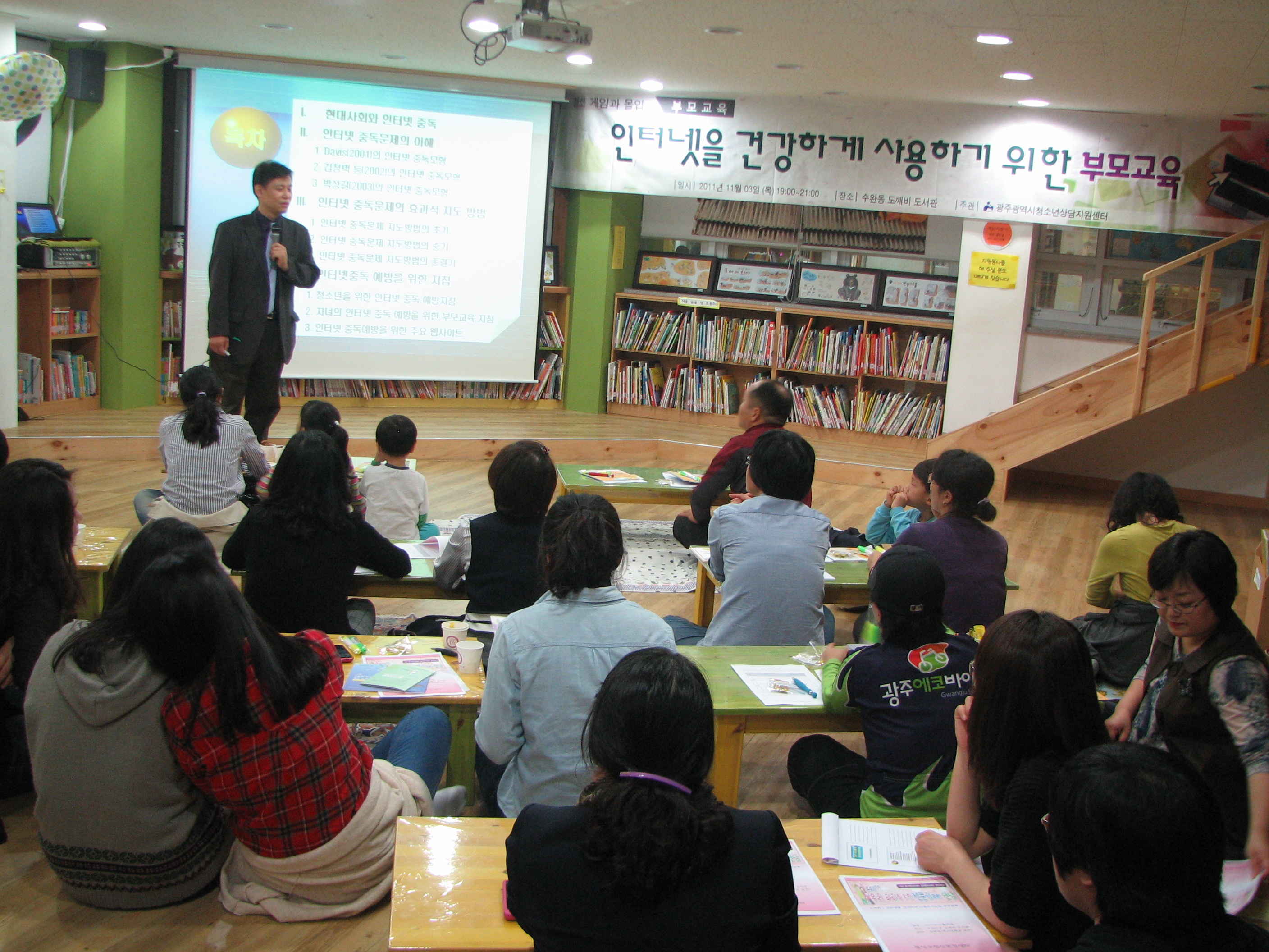 ¡á ºÎ¸ð±³À° Ư° ¥± - ÀÏ ½Ã: 2011³â 11¿ù 10ÀÏ(¸ñ) 19:00~21:00 - Àå ¼Ò: ±¤ÁÖ´ëÇб³ - ³» ¿ë:¡°Ã»¼Ò³â ÀÎÅÍ³Ý °ÔÀÓ°ú¸ôÀÔ ¿¹¹æ ¹× °ÇÀüÇÑ ÀÎÅÍ³Ý »ç¿ëÁöµµ¸¦ À§ÇÑ ºÎ¸ð±³À°¡± - ´ë »ó: Çкθð 50¿©¸í - ° »ç: ±è Åà ȣ ±³¼ö(Á¶¼±´ëÇб³ »ó´ã½É¸®ÇкÎ) - ´ã´ç: ³ë°æÈ »ó´ã¿ø